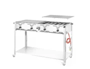 Konstrukcja oraz 2 pojemniki na tłuszcz wykonane ze stali nierdzewnej4 palniki sterowane niezależnieW zestawie 2 niklowane ruszty oraz emaliowana patelnia pokrywająca połowę grilla (wym. wew. 590x480 ...