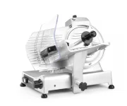 Ręcznie złożone, wyprodukowane we Włoszech. Obudowa wykonana z aluminium, płyta robocza wykonana z tłoczonego arkusza aluminium. Ostrza wykonane ze stali nierdzewnej. Regulacja grubości krojenia za pomocą pokrętła, w zakresie: od 0 mm do 16 mm. Wbudowana ostrzałka zapewniająca stałą skuteczność tarczy tnącej. Silnik chłodzony powietrzem, z zabezpieczeniem przed przegrzaniem. Duża moc silnika i uniwersalne ostrze zapewniają możliwość krojenia kiełbas, serów, wędlin oraz mięs i ryb (bez kości/ości). Spełniają wszelkie wymogi bezpieczeństwa dla urządzeń do użytku profesjonalnego, tj.: – Ustawienie pokrętła na grubość krojenia „0” utrzymuje ostrze za jego osłoną. – Ochrona przed uruchomieniem przy zdemontowanej ostrzałce lub zdjętej osłonie ostrza. – Możliwość zablokowania i zdemontowania wózka tylko przy ostrzu ustawionym w pozycji „0” grubości. – Zabezpieczenie ostrza w postaci zamocowanego na stałe pierścienia. Możliwość demontażu stalowego holdera wykonanego ze stali nierdzewnej i umycia go w zmywarce – łatwe utrzymanie higieny Krajalnica 250 firmy HENDI to włoskie urządzenie typu heavy-duty, które wyróżnia się dużą mocą silnika zapewniającą możliwość krojenia twardych kiełbas, serów, wędlin oraz mięs i ryb (bez kości/ości). Regulacja grubości krojenia pozwala łatwo uzyskać pożądane rezultaty – idealnie cienkie lub grubsze plastry bez względu na rodzaj produktu, czy to wędlina, czy to twardy ser. Dzięki wbudowanej ostrzałce urządzenie zawsze oferuje 100% wysokiej jakości krojenia. Orientacyjny maks. wymiar krojonego produktu: 220x190 mm.