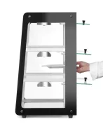 Witryna grzewcza nastawna HENDI wytrzymałą obudowę z malowanej proszkowo stali węglowej oraz drzwi z hartowanego szkła. Jest niezwykle solidna i dodatkowo doskonale eksponuje produkty. Zaprojektowana z myślą o efektywnej prezentacji żywności i kontroli temperatury. Posiada 3 poziomy półek, z których każdy jest wyposażony w halogenowe lampy grzewcze. Regulacja temperatury w zakresie od 50°C do 70°C, umożliwia jej precyzyjne dostosowanie dla każdej półki. Gumowe, antypoślizgowe nóżki zapewniają stabilność urządzenia podczas intensywnej pracy.